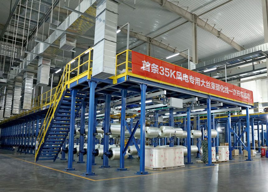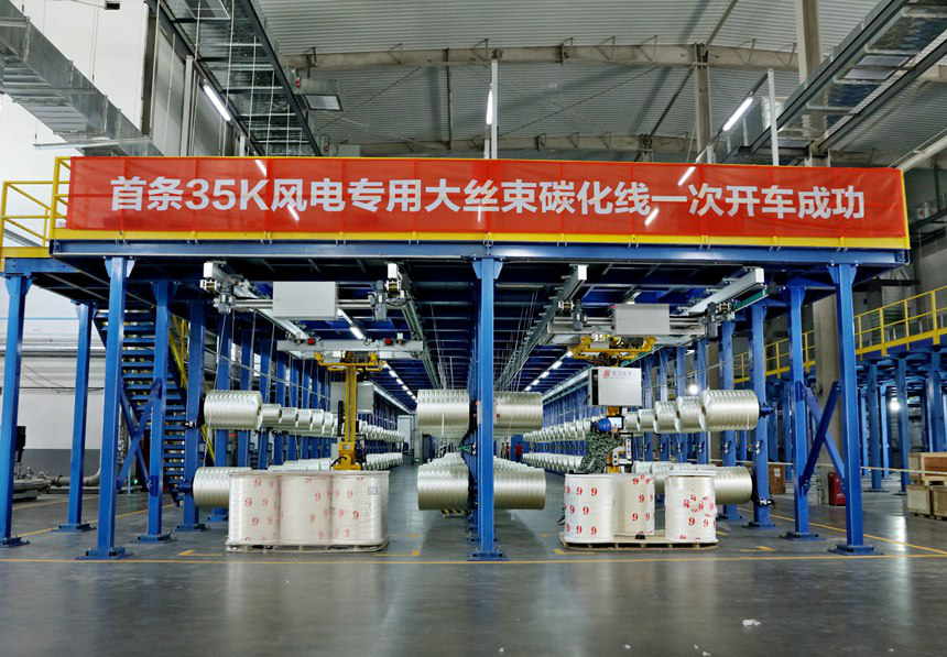 5月22日上午9點58分,吉林化纖首條35K風(fēng)電專用大絲束碳化線一次開車成功。隨著設(shè)備啟動,黑色碳絲纏繞成筒,年產(chǎn)6000噸碳纖維項目5號碳化線一次開車成功,該條碳化線單線產(chǎn)能在2500噸以上,是吉林化纖疫后投產(chǎn)的第一條生產(chǎn)線。
